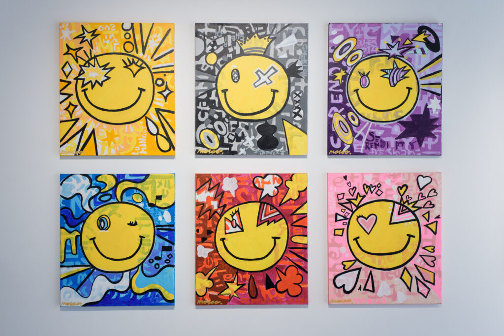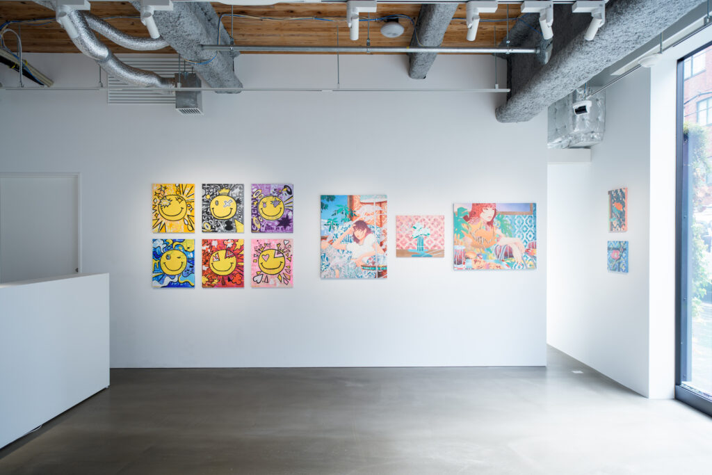 ハタヤママサオ:いろいろな表情のニコちゃんに、6色の背景を描き分けて作っています。ニコちゃんがモチーフの作品はいままでも作っていたんですけど、今回はメッセージ性をもたせたいと思いました。そこで1枚1枚に英単語を割り当ててみたんです。黄色のものは「ルミナス」(光り輝く)、灰色は「チェリッシュ」(慈しむ)、紫色は「セレンディピティ」(ふとした偶然から素晴らしい幸運をつかみ取る)、水色は「メリフルアス」(甘く流れるような心地よさ)、赤色は「レジリエント」(しなやかな強さ)、そしてピンク色は「エセリアル」(優美で繊細な様子)です。