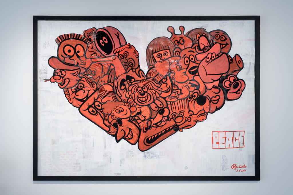 Ryu Ambe:人種も違う、国も違う、宗教も違う人たちが同じ地球で生きているわけで、それをひとつの平和のイメージにまとめるのは相当難しいことなんだなっていうのを感じたのが制作の原点です。いろんな人種の人や、いろんな考え方や宗教を持ってる人たちを頭の中でイメージして、みんなを一箇所のハートマークに押し込めて、やや窮屈そうな表情も描きました。少し皮肉な意図のある作品になっています。