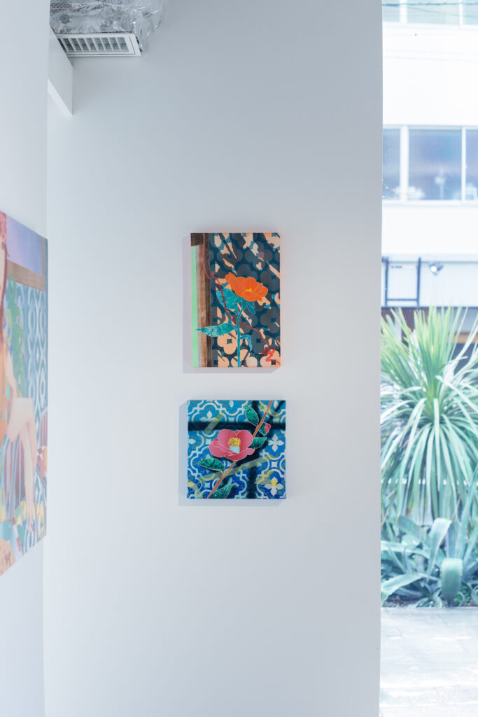 ──お花をモチーフにしたシリーズ作品も展示されています。なかでも、黄色い線のようなものが花の上を横切っている絵が印象的です。