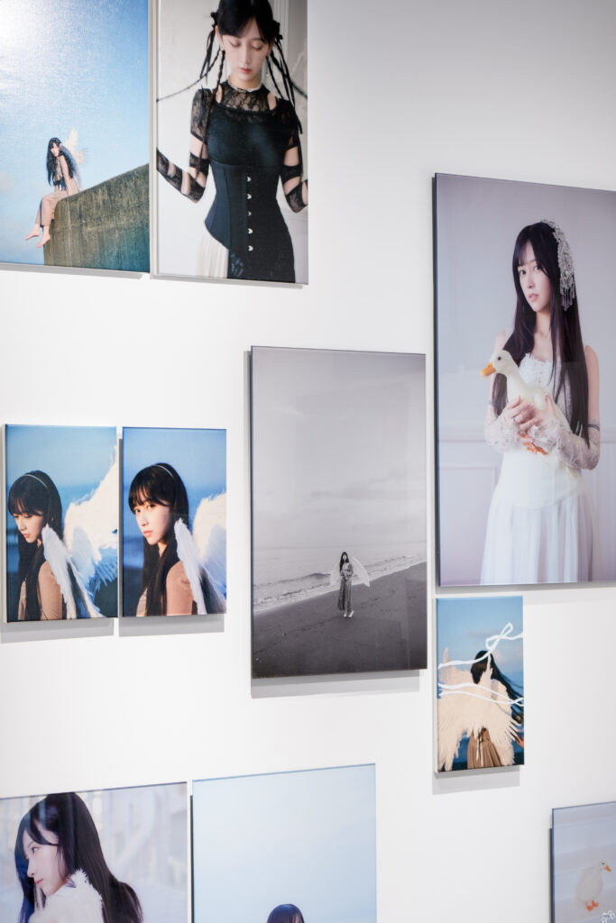 最初に「翼を入れて撮影したい」というイメージがあったんです。それからロケーション、ヘアメイク、衣装も自分でディレクションして、時間帯まで決めて撮影しました。展示全体がモノクロ基調なので、空や海の水色を差し色にしたいなと思って。